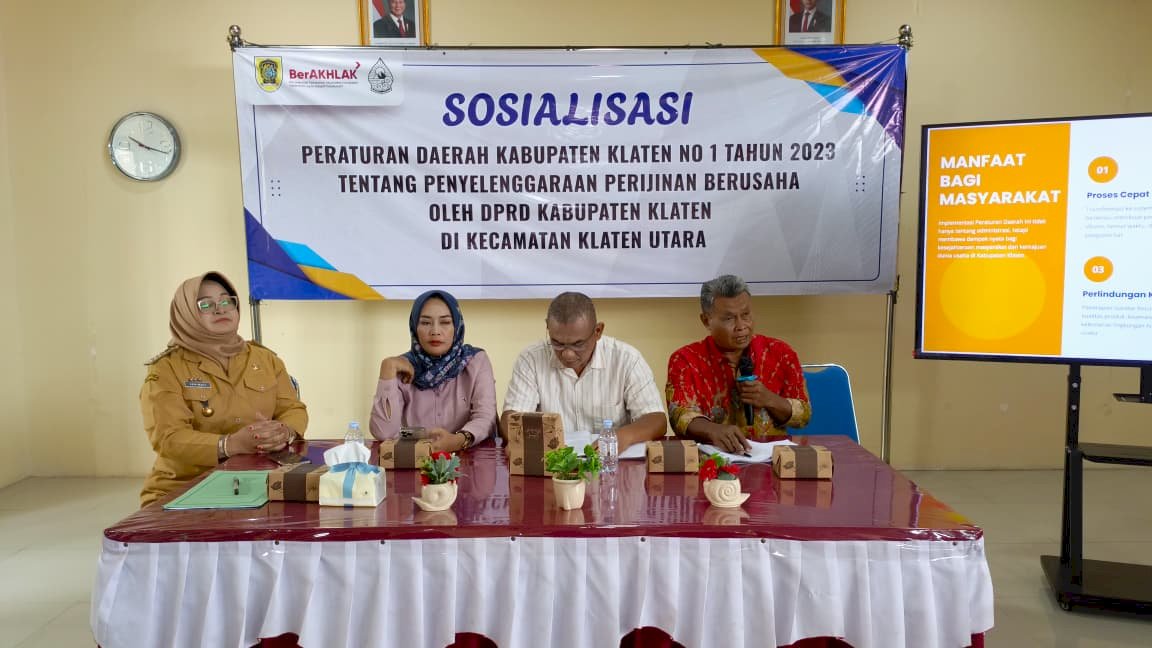 egiatan sosialisasi ini menghadirkan narasumber dari Pimpinan dan Anggota DPRD Kabupaten Klaten yang memberikan penjelasan secara langsung terkait kebijakan, tujuan, serta ruang lingkup Perda tentang Perizinan Berusaha. Peserta kegiatan terdiri dari perwakilan RT/RW serta para pelaku usaha dari seluruh desa dan kelurahan se-Kecamatan Klaten Utara, yang diharapkan mampu menjadi agen informasi di lingkungan masing-masing.